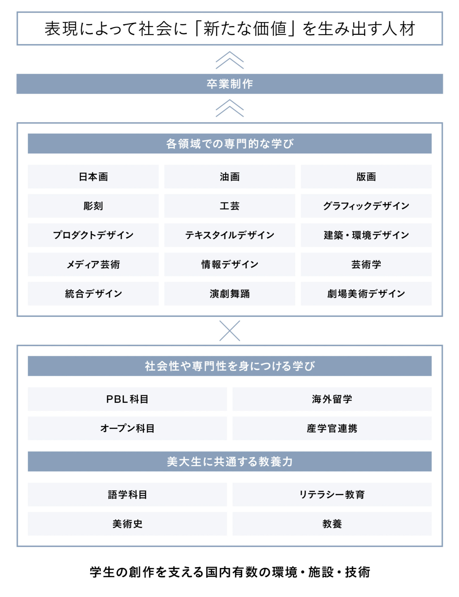 多摩美術大学の学びは、高度な専門性を養う「専門学科科目」、教養を身につける「共通教育科目」の両輪を基本の学びとし、さらに「社会性や専門性を身につける学び」を目的に応じて組み合わせることで、「社会に新たな価値を生み出すクリエーター」の育成を図っています。