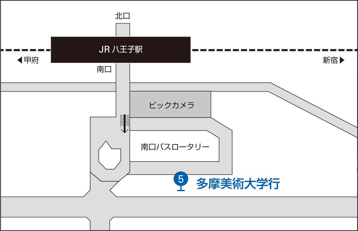 八王子駅南口バスロータリー5番乗り場から京王バス「急行 多摩美術大学行」で約20分。