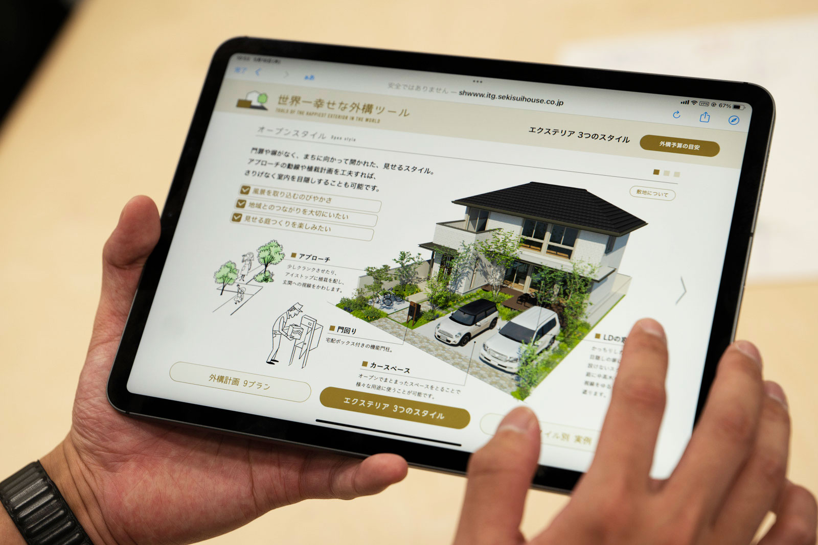 外構設計強化グループという、社内の設計力やデザイン力を高めるための部署で働いています。主に携わっているのが、門扉やアプローチ、庭などのエクステリアの設計力強化です。当社には住宅を総合的に一貫して設計する方針があり、そのための社内研修の運営、iPadツールの開発、物件の分析などに取り組んでいます。特に深く携わったのが、支店の営業・設計担当者が利用するためのiPadツールの開発です。開発ありきのプロジェクトではなく、社内で何が求められているのかヒアリングするところからスタートしました。やがて把握したのが、社員がエクステリアの魅力をお客さまに伝えきれていないという課題です。そこで、お客さまの前で説明しやすいスライドのようなiPadツールを開発し、プレ運用でも好評だったので、これから全国展開されることになりました。