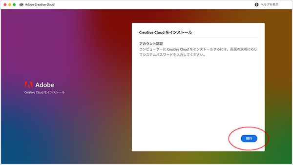 3. 「続行」をクリックしてインストールを開始します。途中、ご自身のパソコンのパスワード(パソコン起動時に入力するパスワード)の入力を求められる場合があります。