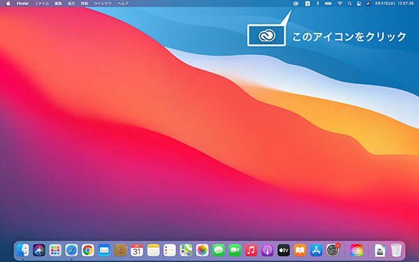 1. Adobe Creative Cloudのアイコン(Macの場合、画面上部のメニューバー/Windowsの場合、場面右下のタスクバー)をクリックして「Creative Cloud アプリ(Creative Cloud デスクトップアプリケーション)」を起動します。