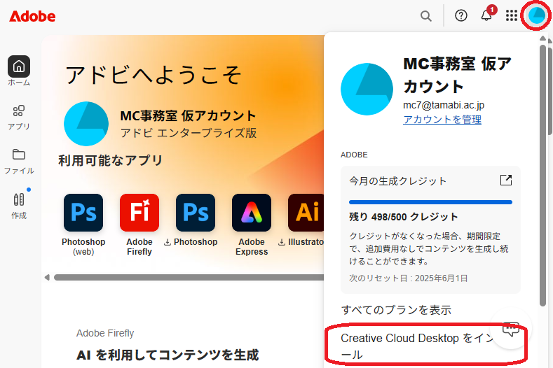 インストールの表示が出ない場合には、画面右上の丸いアイコンをクリックして出てくるメニューから、「Creative Cloud Desktopをインストール」をクリックします。