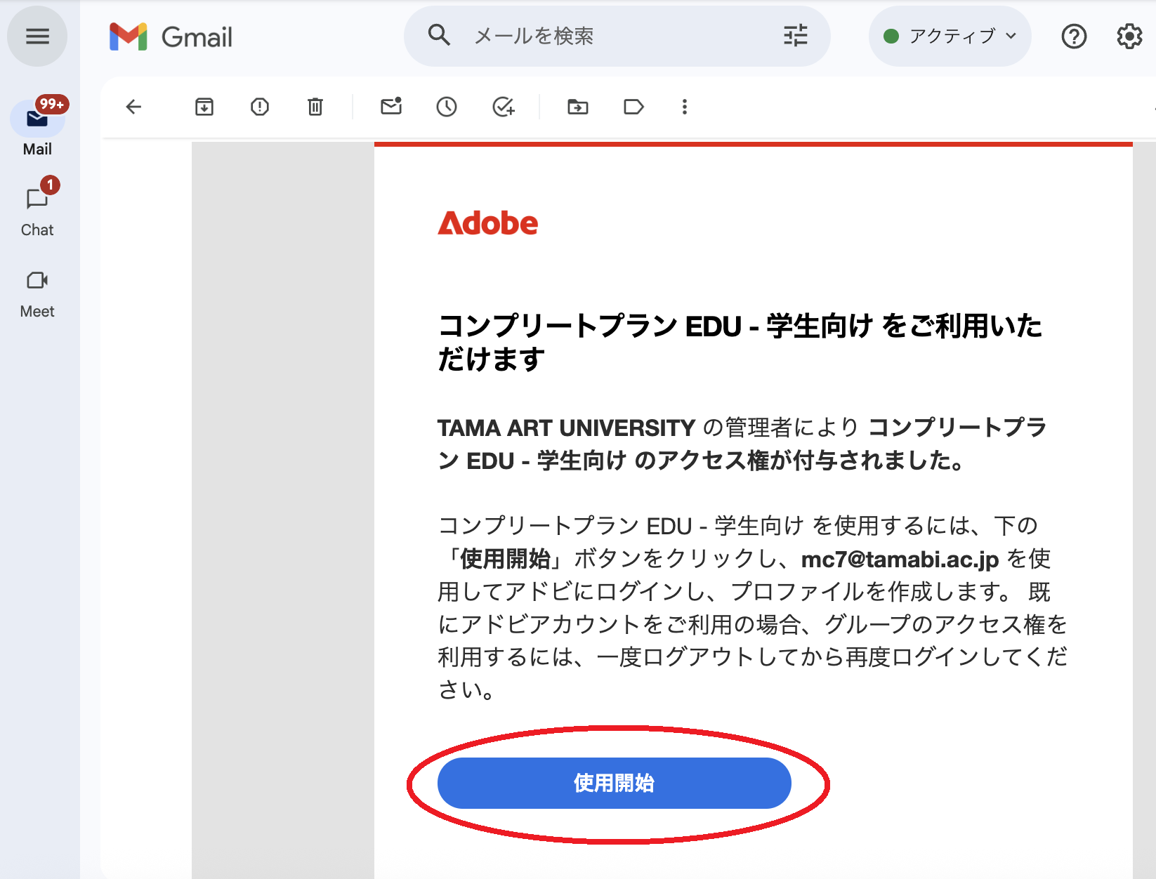 1. Google WorkSpace for Educationのメール([学籍番号]@stdt.tamabi.ac.jp)に届いているメール「All Appsプランをご利用いただけます」を開き、「使用開始」をクリックします。