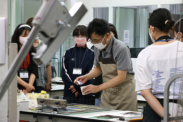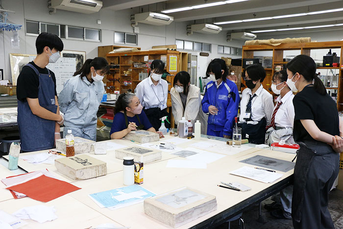 今年は連携校の東京都立片倉高校、東京都立八王子桑志高校、東京都立工芸高校、神奈川県立相模原弥栄高校、東京都立世田谷総合高校、千葉県立幕張総合高校の生徒36名が参加し、オープンキャンパスでの「はじまりの美術・デザイン」と題したプレ教養総合講座や、油画専攻・版画専攻・環境デザイン学科の実技講座を受講しました。